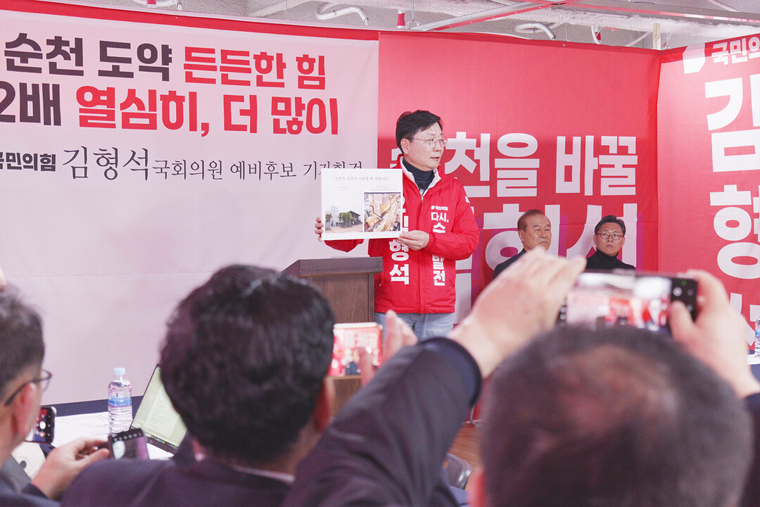 | ▲지난 12일 순천‧광양‧곡성‧구례(갑) 김형석 국민의힘 국회의원 예비후보(전 통일부 차관)가 공약을 발표하고 있다. [강병현 기자] |