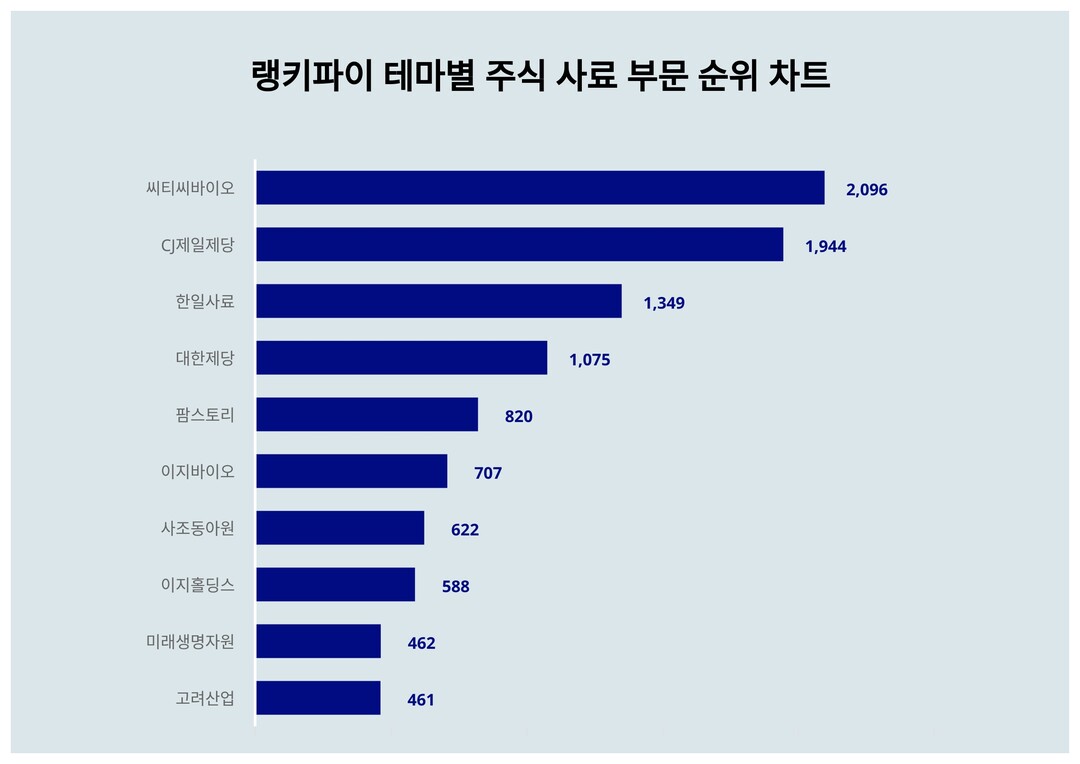 랭키파이 빅데이터를 분석한 테마별 주식 사료 부문 트렌드지수 2024년 3월 2주차 지표이다.