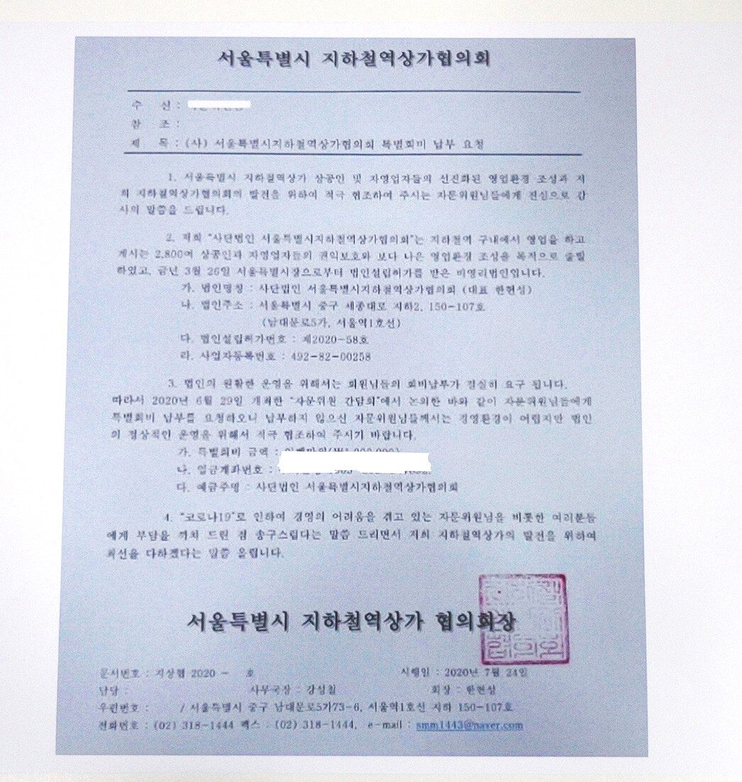 | ▲(주)하솜채 주소가 적혀있는 서울특별시 지하철역상가 협의회가 회원들에게 보낸 공문. 사진=CWN |