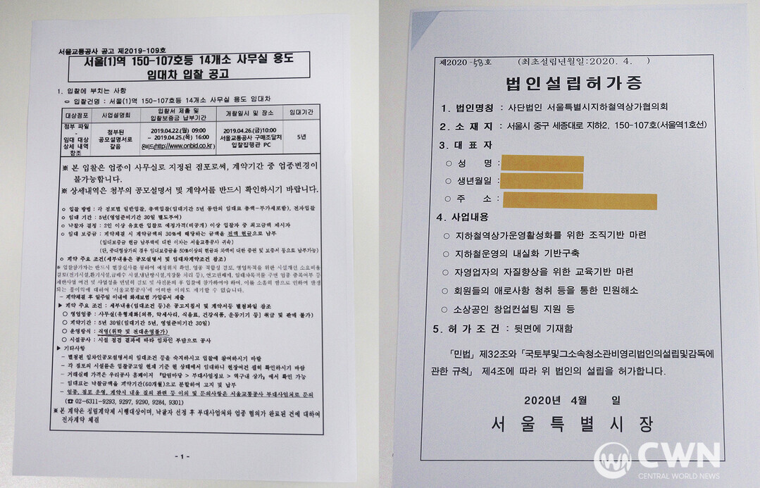 | ▲사무실의 위탁 및 전대운영불가를 명기한 서울교통공사의 서울[1]역 150-107호등 14개소 사무실 용도 임대차 입찰 공고문(왼쪽)과 서울특별시지하철역상가협의회가 위법 주소를 사용해 서울시로 부터 받은 법인설립허가증(오른쪽). 사진=CWN |