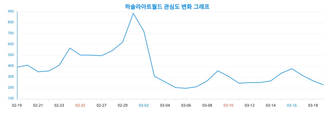 이번 분석을 통해 얻어진 하슬라아트월드에 대한 일간 변화 추이 차트는, 하슬라아트월드에 대한 관심이 어떻게 변화했는지를 생생하게 드러낸다.