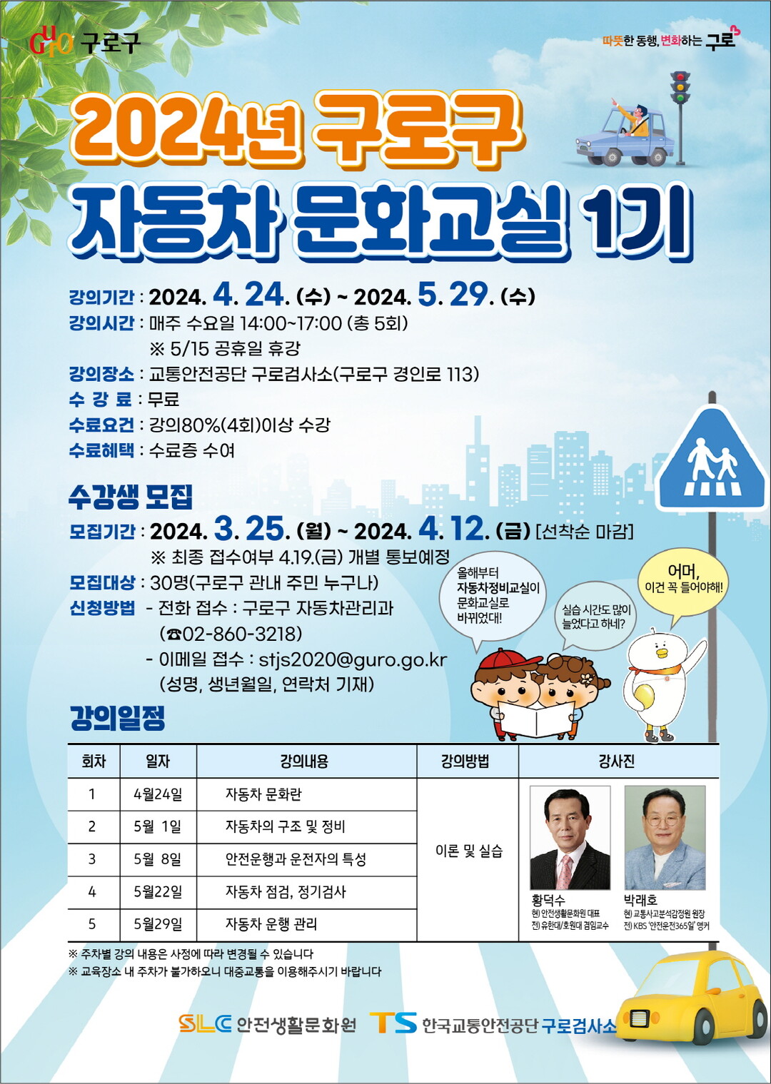 [CWN 정수희 기자] 서울 구로구는 ‘2024년 자동차 문화교실 1기’ 수강생 30명을 선착순 모집한다고 22일 밝혔다.