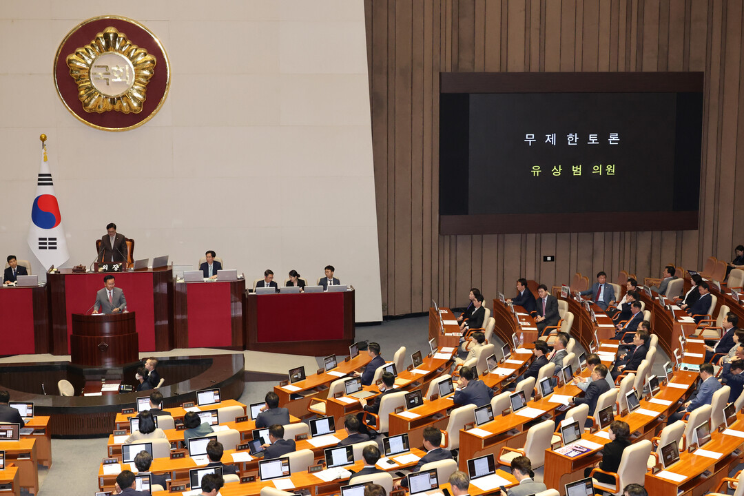 | ▲ 3일 국회에서 열린 제415회국회(임시회) 제5차 본회의에서 순직 해병 수사 방해 및 사건 은폐 등의 진상규명을 위한 특별검사의 임명 등에 관한 법률안에 대한 필리버스터(무제한 토론)이 진행되고 있다. 사진=뉴시스 |
