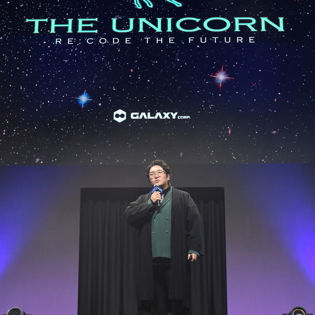 최용호 갤럭시코퍼레이션 대표가 10일 서울 강남구 코엑스에서 열린 국내 최대 규모 글로벌 스타트업 페스티벌인 '컴업(COME UP) 2025'에서, 공식적으로 유니콘 기업(기업가치 1조 원 이상) 입성을 발표하고 있다.