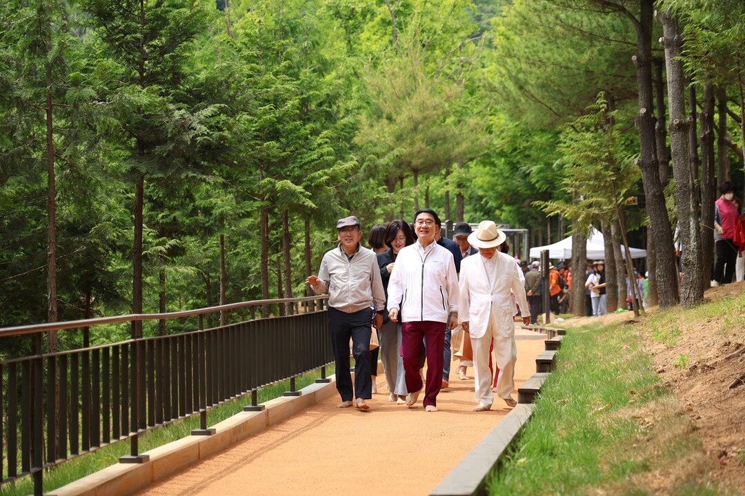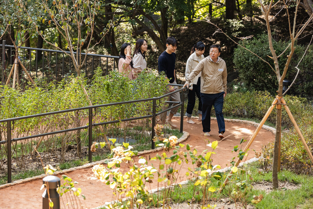 | ▲ 김경호 광진구청장(맨 앞)이 정원맨발길 걷고 있다. 사진=광진구 |