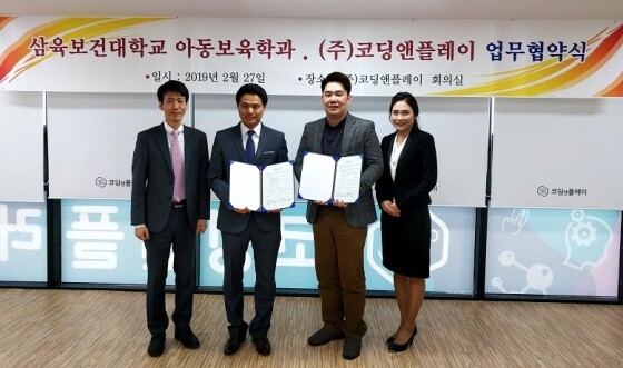 코딩교육 콘텐츠 전문 기업인 코딩앤플레이가 최근 삼육보건대학교 아동보육학과와 업무협약을 체결했다고 5일 밝혔다. 이날 협약식에는 이정석 코딩앤플레이 대표이사, 삼육보건대 문동규 아동보육학과장, 강병철 직업교육혁신센터장, 양승아 국내사업본부장이 참석했다.