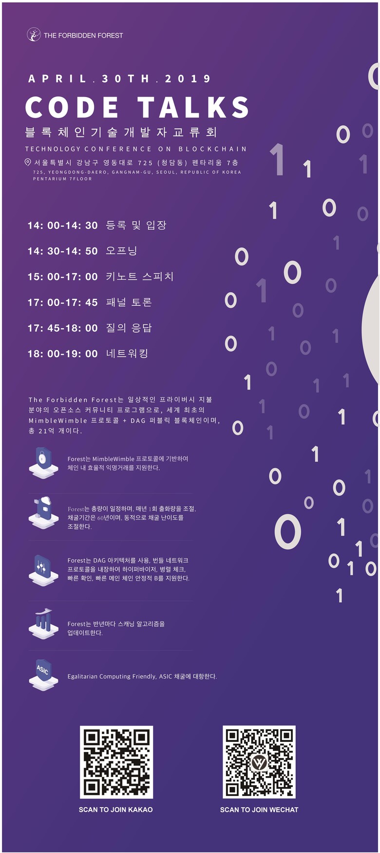 The Forbidden Forest 관계자는 "‘Code Talks’ 블록체인 기술개발자교류포럼이 블록체인 분야의 기술인력들에게 글로벌 커뮤니케이션과 상호 추진을 위한 장을 제공할 것이며 함께 하는 토론을 위해 많은 참여와 관심을 부탁드린다"고 말했다.
