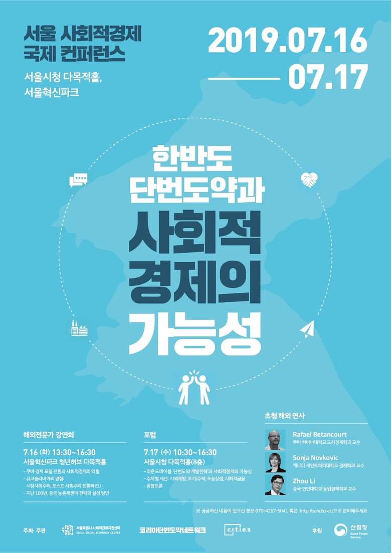 이러한 시대적 흐름에 부응하여 서울시 사회적경제지원센터(이하 센터)가 코리아단번도약네트워크, 씨티즈(C.I.T.I.E.S, 사회연대경제 혁신과 지식 이전을 위한 국제교류센터) 공동 주관, 산림청 후원으로 16~17일 서울혁신파크 및 서울시청 다목적홀에서 ‘2019 서울 사회적경제 국제 컨퍼런스-한반도 단번도약과 사회적경제의 가능성’을 개최한다.