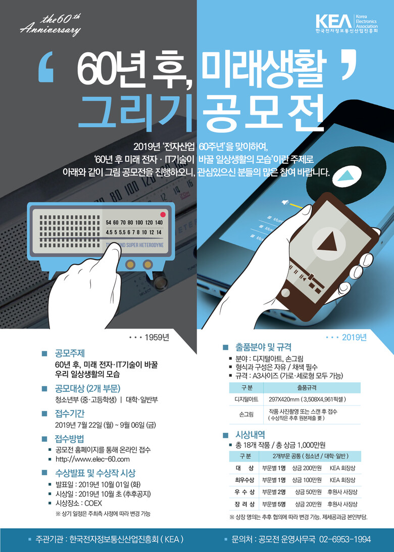 1959년 진공관 라디오(A501) 생산으로 시작된 국내 전자산업은 2018년 전자·IT 수출 역대 최대를 기록하며 전체 수출의 36%를 차지하는 주력산업으로 성장했고, 올해는 ‘전자산업 60주년’이 됐다. 한국전자정보통신산업진흥회가 이를 기념해 산업 중요성에 대한 국민 인식을 제고하고 4차 산업혁명 시대를 선도하는 계기를 마련하고자 ‘60년 후, 미래생활 그리기 공모전’을 진행한다.