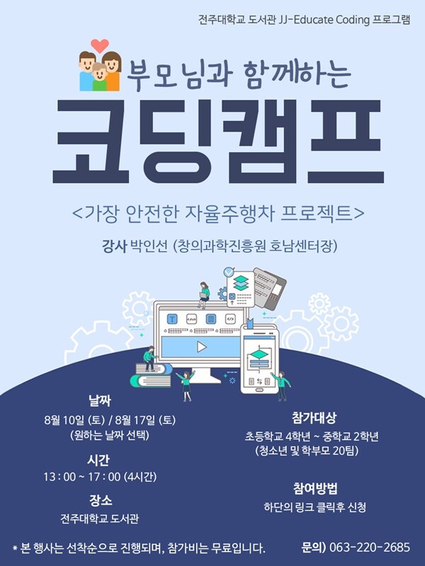창의과학진흥원 호남센터와 협력해 진행하는 이번 코딩캠프는 11세부터 15세까지의 청소년과 그 학부모, 20팀을 대상으로 진행되며 학생과 학부모들에게 코딩교육에 대한 중요성을 인식시키고 코딩 프로젝트를 통해 학생들의 IT분야 창의력과 문제해결능력을 향상하기 위해 진행된다.