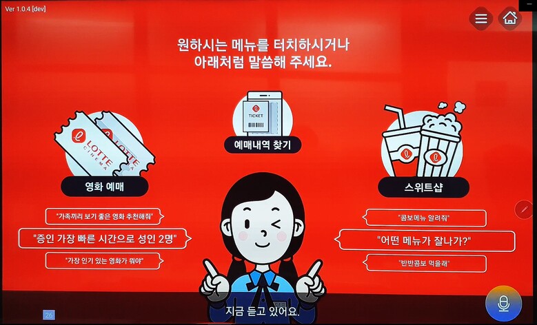 이제 영화관에서는 원하는 영화를 선택하고 이에 따른 복잡한 과정 없이 ‘음성버튼’을 선택하고 원하는 영화정보를 말하는 방식으로 “알라딘 제일 빠른 시간으로 성인 2명”, “미니언즈 팝콘 콤보 2개” 등 사람에게 말하듯 얘기를 해도 이에 대응이 가능해진 것이다.