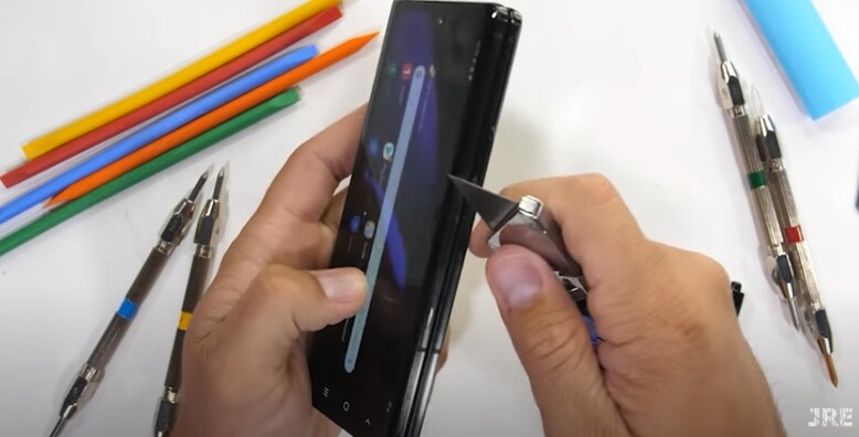 내부 디스플레이도 동일한 방식으로 테스트가 진행됐다. 그 결과, 외부 디스플레이보다는 내구성이 상대적으로 약한 것을 확인할 수 있었다. 내부 디스플레이를 바늘로 긁고 화면 보호 테이프를 제거했을 때, 디스플레이에는 아무런 이상이 없었다.