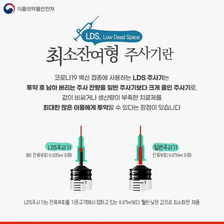 LDS 주사기는 백신 한 병당 1~2명에게 추가 접종을 할 수 있을 것으로 기대된다. 버려지는 약물을 최소화하기 때문에 코로나19 백신 접종 인원을 확대할 수 있다고 기대되고 있다.