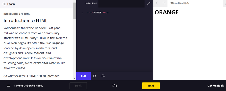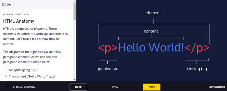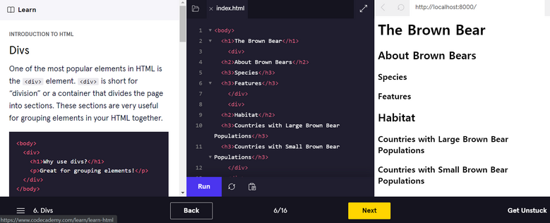 예를 들어 <p></p>코드나 <div></div>코드의 사용 방법과 사용 예시들에 대해 자세하게 사이트에 설명되어 있으며 이를 직접 실행해 보면서 쉽게 배울 수 있다.