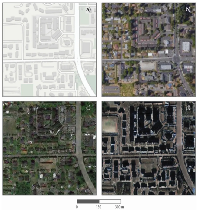 예를 들어 타코마의 도로와 건물 위치(사진 오른쪽 위)를 사용하지만, 베이징의 더 높은 건물(오른쪽 아래)이나 시애틀의 낮은 건물(왼쪽 아래)을 겹쳐서 배치할 수 있다. 조경 식물을 추가할 수도 있다. 생성된 결과물은 완벽하지는 않지만, 딥페이크 비디오를 만드는 것보다 딥페이크 위성사진을 만드는 것이 훨씬 쉽다. 사진에서 어색한 부분을 낮은 화질의 탓으로 돌릴 수 있기 때문이다.