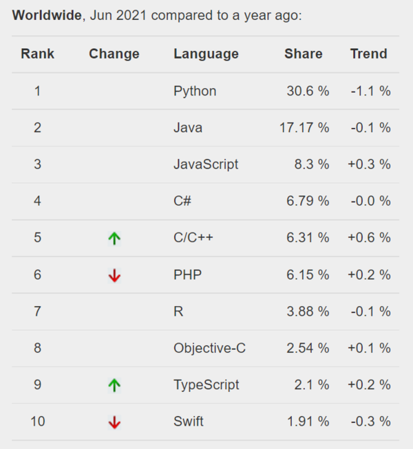 간결하고 생산성 높은 프로그래밍 언어 파이썬(python)이 6월 티오베 지수(TIOBE Index) 2위를 기록했다. PyPL 인기도 순위(PYPL PopularitY of Programming Language)는 1위를 차지했다.