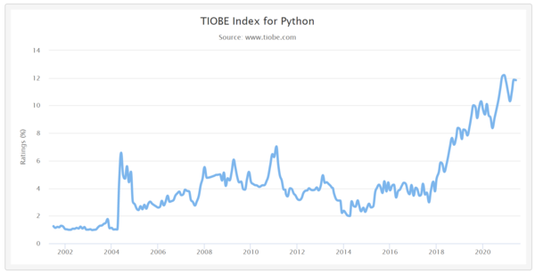 파이썬의 연도별(Very Long Term History) 점유율은 1996년 20위에서 올해 3위로 껑충 뛰었다. 파이썬은 지난해 올해의 프로그래밍 언어(Programming Language of the Year)로 선정되기도 했다.