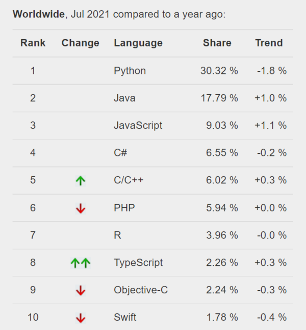R은 PyPL 인기도순에서 3.96%로 7위를 기록했다.