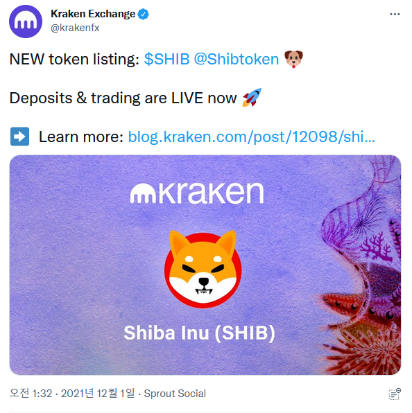 크라켄은 11월 2일, 공식 트위터 계정에 "좋아요 수가 2,000건을 넘기면, 시바이누를 상장할 것"이라는 트윗을 게재했으며, 해당 게시글의 좋아요 수는 총 6만 건을 기록했다. 그러나 상장 과정이 다소 지연되면서 시바이누 팬의 원성을 샀으나 드디어 시바이누 상장이 정식으로 완료됐다.