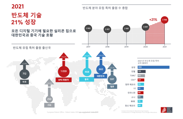 대한민국 기업들은 2021년 반도체 분야에서의 특허 출원을 전년 대비 36.2% 늘리는 강한 성장세를 보이면서 반도체 분야에서 대한민국의 비중을 18%로 끌어 올렸다. 반도체 분야 유럽 특허 출원에서 대한민국이 차지하는 비중이 2017년에는 12%에 불과했으나, 이를 6% 늘리면서 반도체 분야의 혁신을 이끄는 국가들 중 가장 가파른 성장세를 기록했다. 삼성은 2021년에 전년 대비 57% 더 많은 반도체 특허를 출원하며 반도체 분야의 전체 특허 출원 중 13%를 홀로 기록했다. 이는 각각 3%대의 비중을 차지하는 2위 인텔 및 3위 TSMC의 기록을 훨씬 웃도는 확고한 1위다.