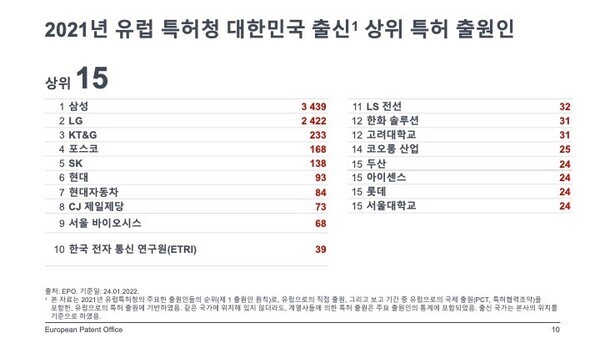 2021년에 총 3,439개의 특허를 출원한 삼성(전년 대비 5% 증가)이 다시 한 번 대한민국 내 EPO 최다 출원인이었으며, LG(2,422개), KT&G(233개), 포스코(168개), SK(138개)가 그 뒤를 이었다. 기업별 글로벌 순위에서 삼성은 2020년 1위였으나, 2021년에는 한 계단 하락한 2위를 기록했으며, LG는 전년도와 동일하게 3위를 유지했다. 중국의 화웨이는 전년도 2위였던 것에 반해 2021년에 1위에 등극했다.