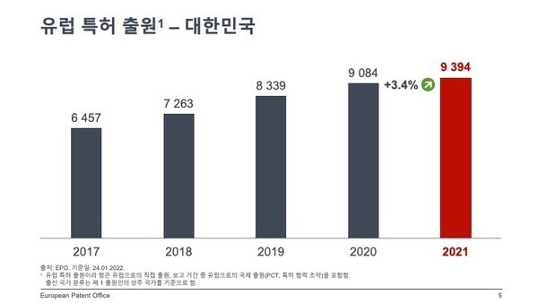 대한민국의 2021년 EPO(유럽 특허청) 특허 출원 수가 팬데믹에도 불구하고 3.4% 증가한 9394 건에 달하여 역대 최고 기록을 갱신했다. 금일 발간된 2021년 EPO 특허 지수에 따르면 대한민국 특허 출원의 전체적인 성장세는 지난 3년 대비 한 풀 꺾였으나, 디지털 통신과 반도체 같은 주요 기술 분야에서 상당한 비중을 차지하며 존재감을 드러냈다.