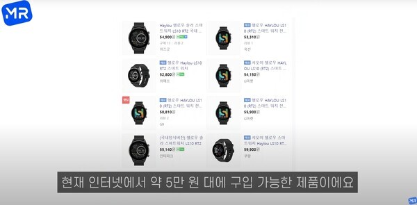 제품 리뷰에 앞서 엠알은 "애플워치와 갤럭시워치, 다른 스마트워치까지 다 해서 30개 넘게 구입해봤다. 그 중에서 가성비 갑은 'LS10 RT2'란 제품이다. 이는 '가성비 스마트워치의 선두주자'라 할 수 있는 회사 '헬로우'에서 출시한 것으로 각진 모양의 스마트워치 'LS02'와 'LS05' 후속작"이라 간단하게 소개했다.
