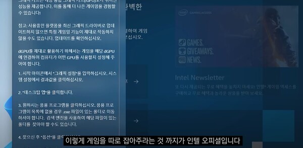 Arc 외장그래픽은 "제대로 활용하려면 'Samsung Settings' 성능 탭으로 들어가 고성능 모드로 바꿔주고, 윈도우 설정에서 전원 모드를 최고 성능으로 설정해줘야 한다. 또 '그래픽 설정'에서도 게임 exe 파일을 찾아 옵션을 눌러 '고성능'으로 바꿔야 한다. 여기까지가 인텔 오피셜"이라 설명했다.