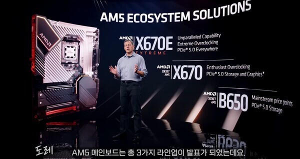AM5 메인보드는 총 3가지 라인업이 발표됐다. 오버클럭 환경을 위한 최상위 메인보드 칩셋인 'X670E', X570 상위호환인 'X670'과 B550을 대체하는 중급형 칩셋 'B650'이 그 주인공이다. 당연히 각 제조사의 최상위 라인업도 X670E 메인보드로 출시된다.