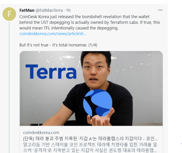 15일(현지시간) 테라 커뮤니티 구성원이자 리서치 포럼 내 네임드 유저 팻맨(FatMan)이 자신의 트위터를 통해 "코인데스크코리아에서 지칭한 월렛A가 LUNC DAO의 월렛이 아닌, 쿠코인의 핫 월렛이다. 이는 리포트 전체를 무의미하게 만든다"고 비판했다.