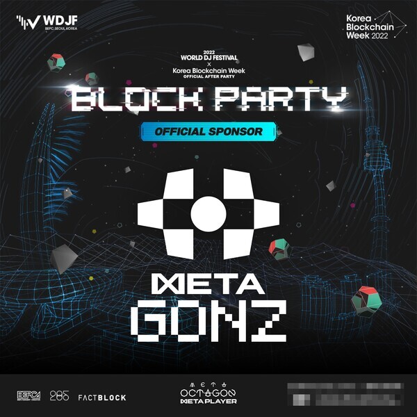 EDM 및 공연문화 기반의 엔터테인먼트 메타버스 프로젝트를 전개하고 있는 ‘메타옥타곤'의 메타휴먼DJ & NFT 프로젝트 ‘METAGONZ (메타곤즈)’ 가 '코리아 블록체인 위크 2022(KBW2022)'의 공식 애프터 파티 '블록파티 2022' 페스티벌에 후원사로 참여한다.