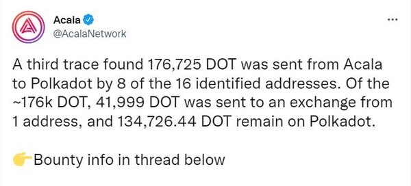18일(현지시간) 아칼라는 공식 트위터를 통해 "식별된(오발행 물량이 유입된) 16개 주소 중 8개 주소가 폴카닷으로 17만6725 DOT을 전송했음을 발견했다"며 "이중 1개 주소가 4만1999 DOT을 거래소로 전송했으며 13만4726.44 DOT은 폴카닷에 남아 있는 상태"라고 밝혔다.