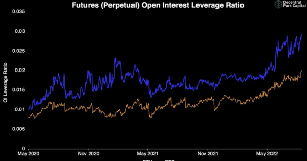 특정 자산의 무기한 선물 계약에 묶인 달러 가치를 암호화폐의 시가총액으로 나눠 계산되는 무기한 선물 미결제 약정 레버리지 비율(Futures Open Interest Leverage Ratio)은 비트코인과 이더리움이 각각 0.03, 0.02를 기록하며 사상 최대치를 기록했다는 설명이다.