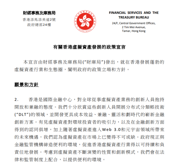 홍콩 재무장관인 폴 찬(Paul Chan)은 "우리는 이번 성명서를 통해 가상자산에 대한 홍콩의 비전과 전략, 규제 시스템 등에 대한 태도와 입장을 분명히 밝혔으며, 글로벌 가상자산 산업이 국제 금융 중심지인 홍콩의 위상을 100% 활용하기를 기대하고 있다"고 말했다.