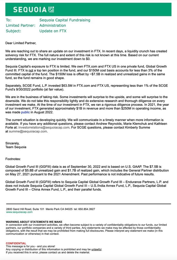 FTX의 주요 투자자 중 한 곳으로 알려진 세쿼이아 캐피털(Sequoia Capital)이 파트너사들에게 전달한 서한에서 "내부적인 이해를 바탕으로, FTX 및 FTX US에 이미 투자된 부분을 0으로 표기하고 있다"고 밝혔다.