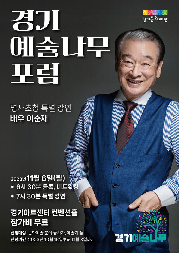 오는 6일 개최되는 첫 번째 '경기예술나무 포럼'은 참가자들이 서로 자유롭게 인사하고 교류하는 네트워킹의 시간으로 1부를 구성했다. 2부에는 대한민국 대표 원로배우 이순재(89세)를 연사로 모셔서 이야기를 듣는 명사 특강을 마련했다.